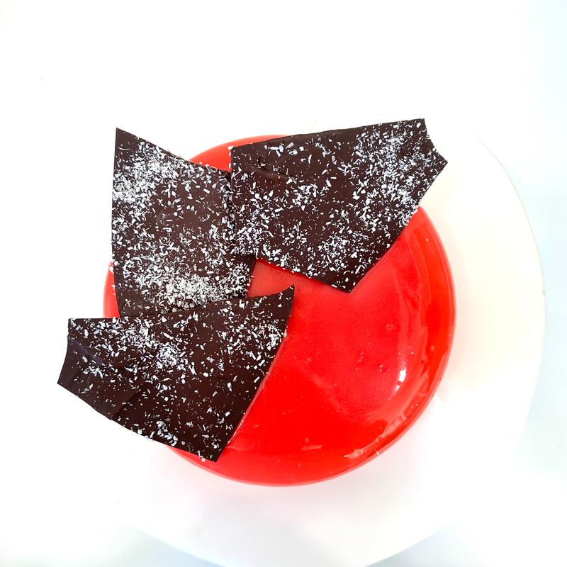 dark chocolate genoise, coconut chia pudding, strawberry curd, white chocolate crème fraîche whipped ganache, mirror glaze, tempered dark chocolate coconut shards