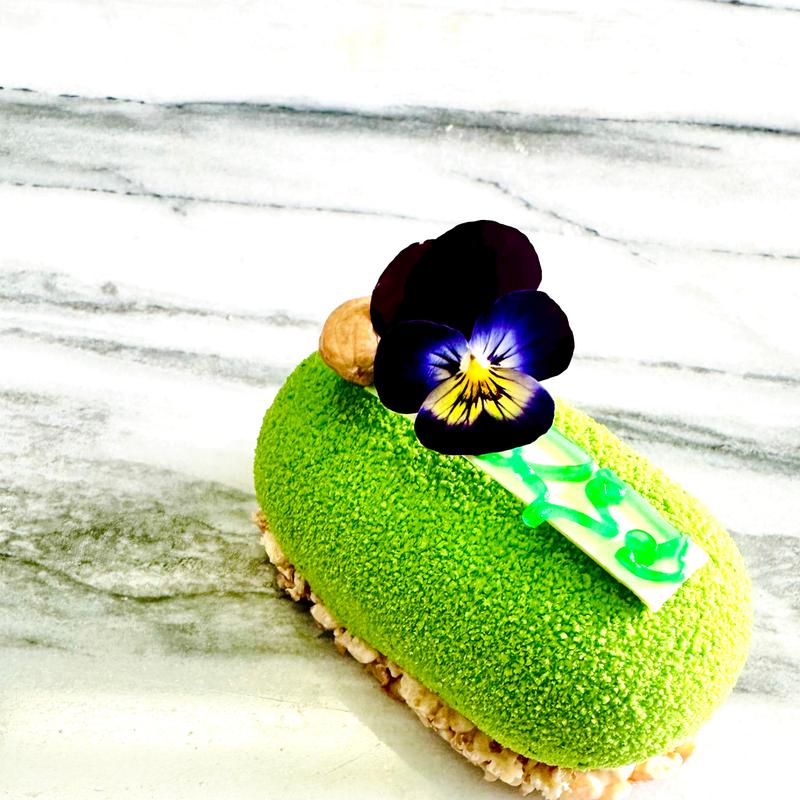 kiwi rum confiture, cashew sponge, mint créme fraîche whipped ganache, cashew crispy base