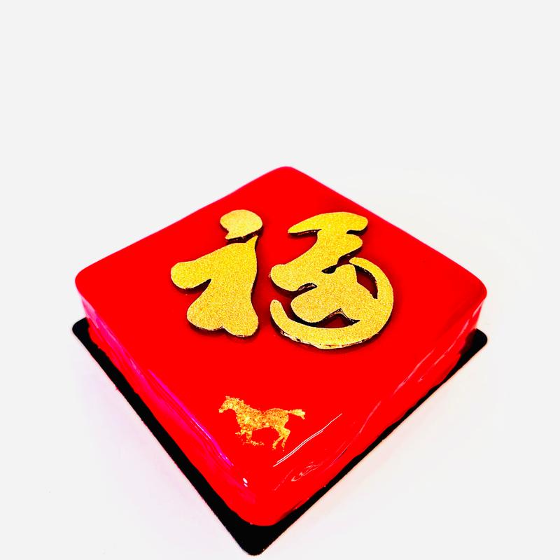 mandarine mousse, grape grapefruit confiture, buddha's hand ginger cake, gilded dark chocolate character "good fortune", gold horse stamp